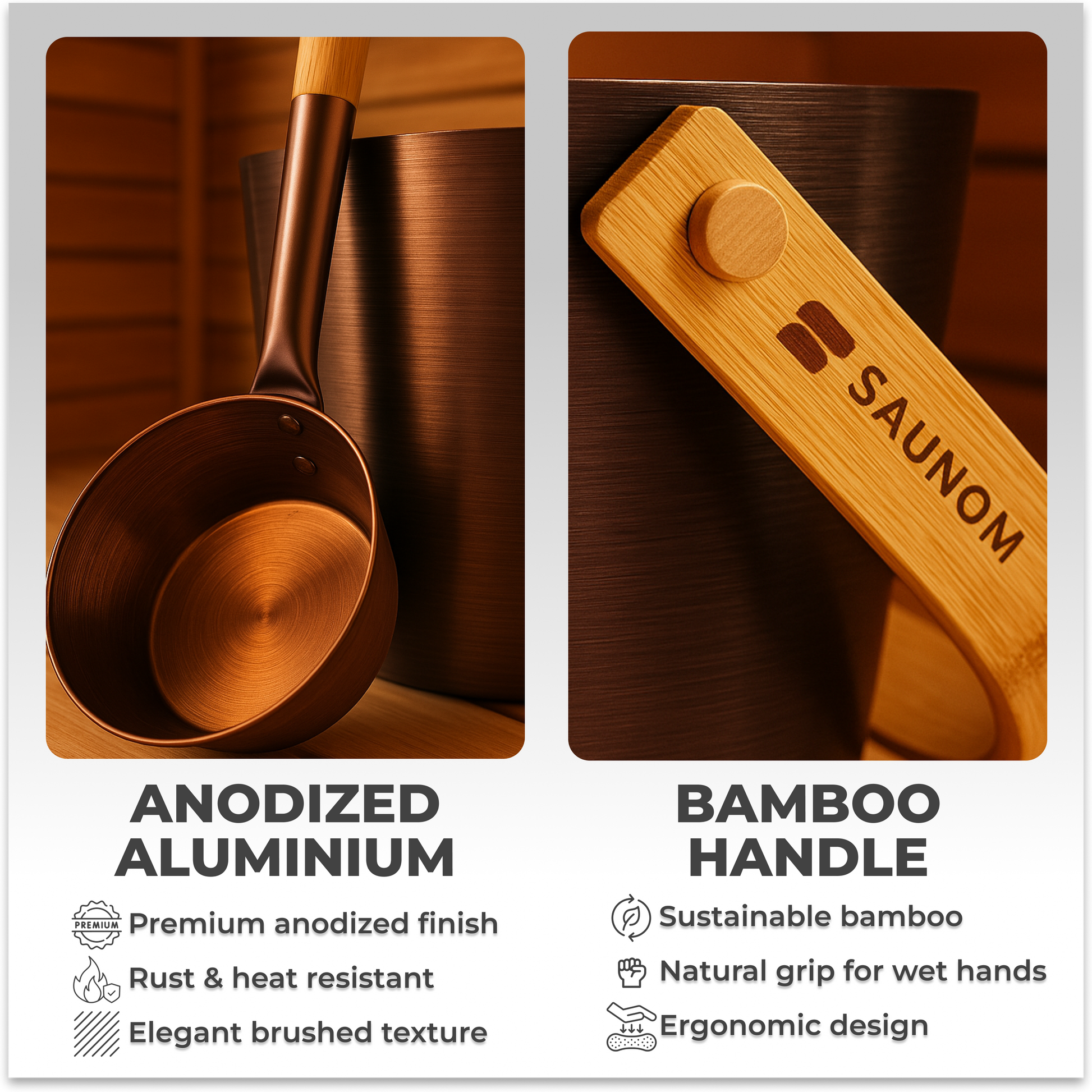 - LUXURY NORDIC DESIGN FOR YOUR SAUNA EXPERIENCE — Instantly elevate your sauna with this stunning set. The elegant brushed anodized aluminum bucket, paired with a beautifully crafted bamboo handle, brings modern Nordic style and sophistication to any sauna — transforming your daily ritual into a moment of relaxation and luxury.